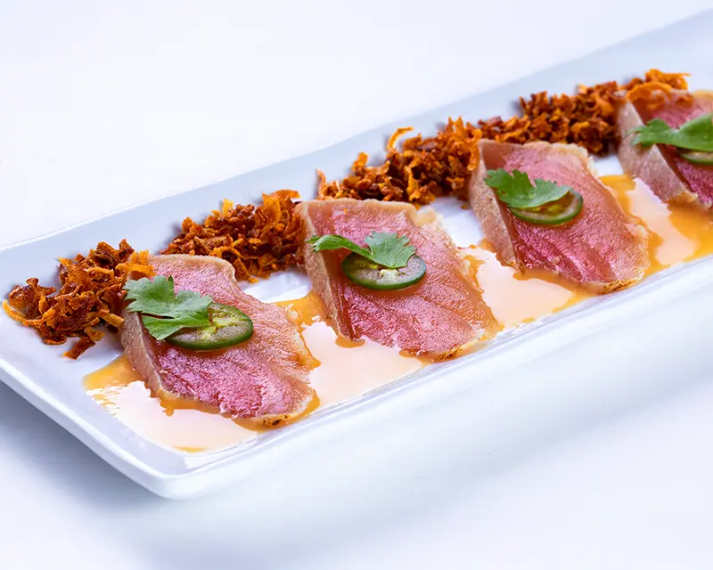 Lettuce, cucumber, carrot, and avocado roll. Topped with tuna, fried onion, and garlic ponzu.