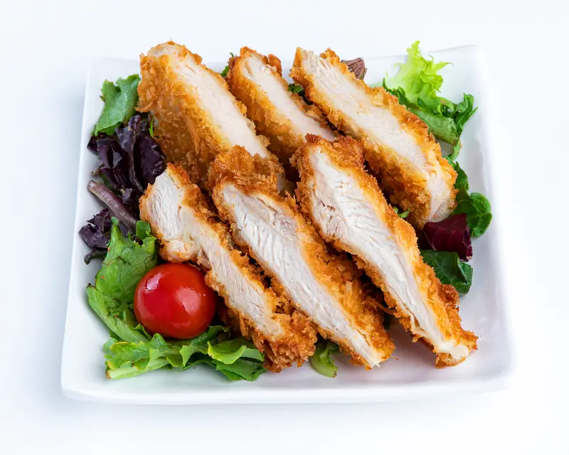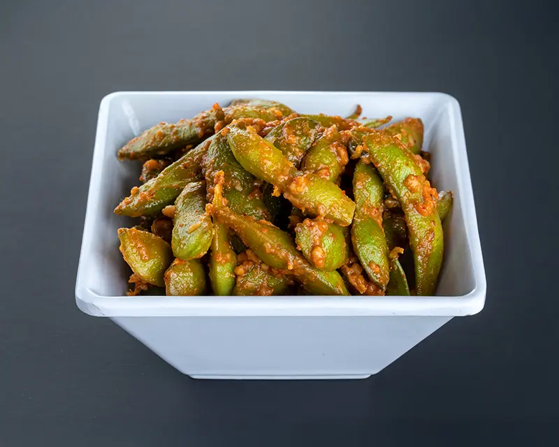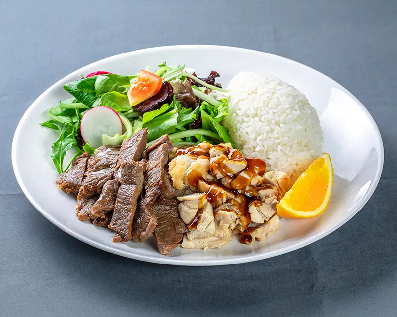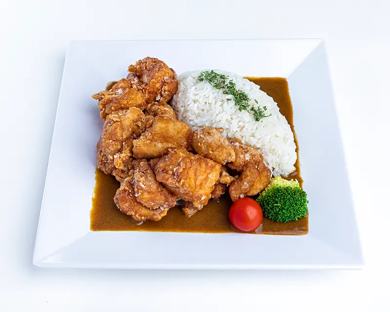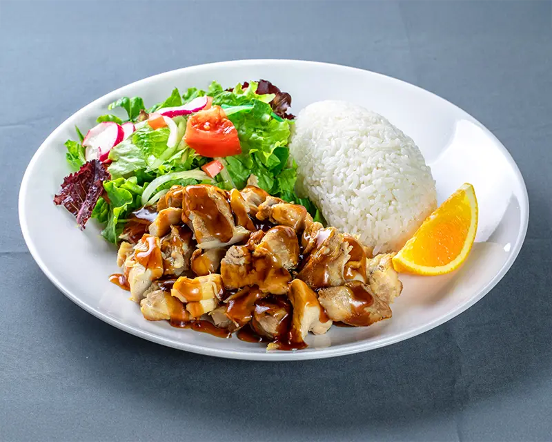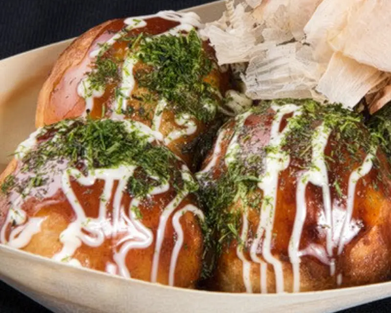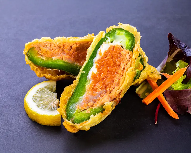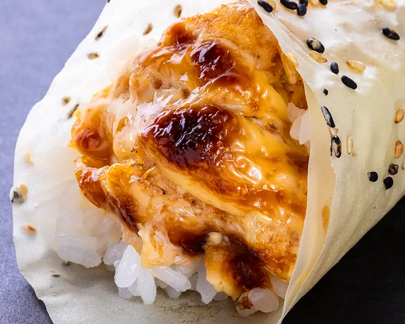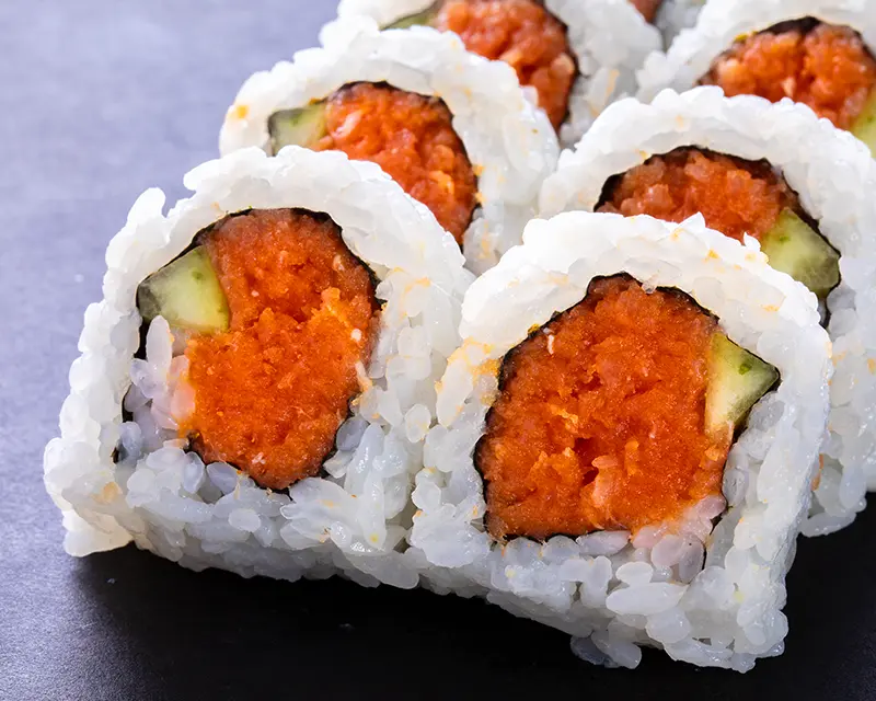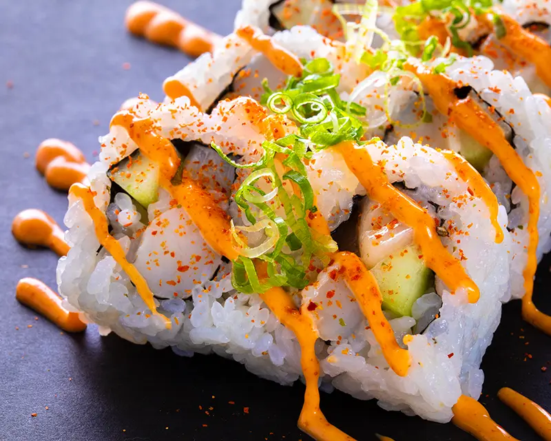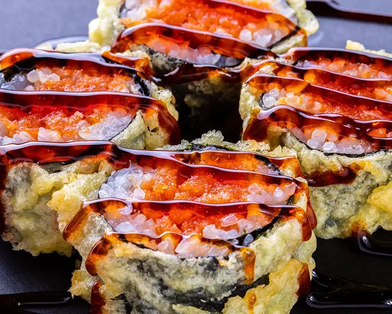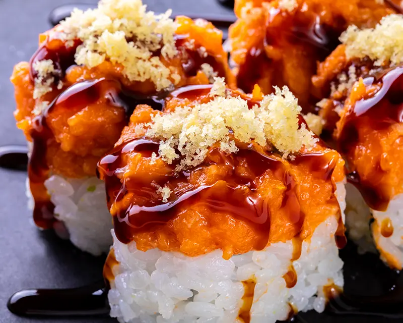 Chicken, avocado, cucumber, cream cheese, and sriracha roll. Topped with crunchy flakes and teriyaki sauce.