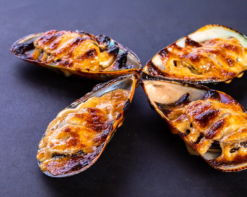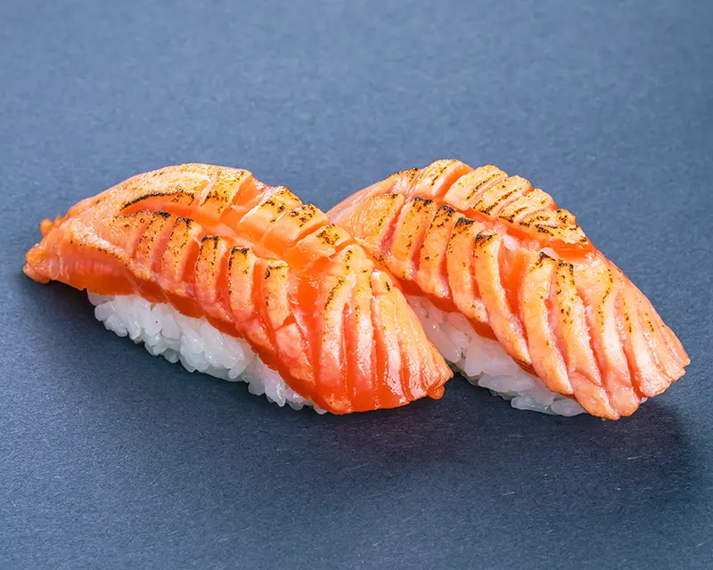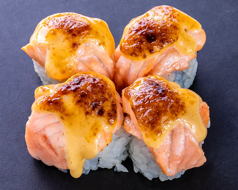 Baked salmon and dynamite sauce on top of a California roll.