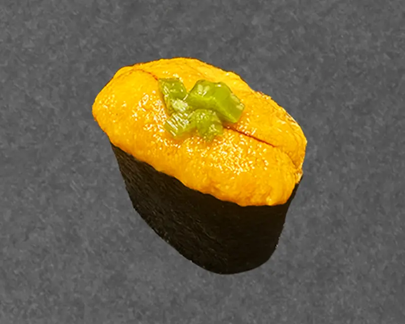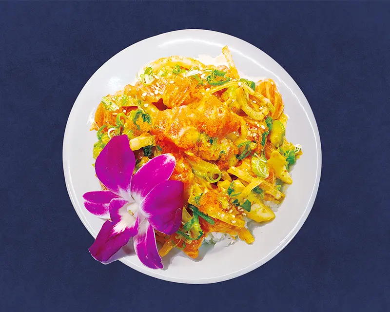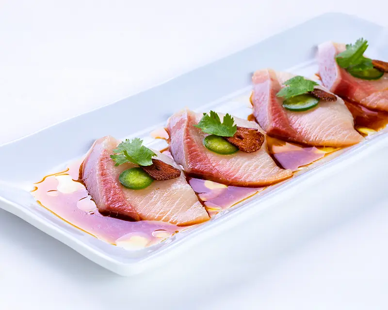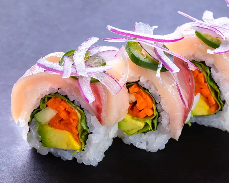 Lettuce, carrot, and avocado roll. Topped with yellowtail, raw onion, jalapeno, garlic ponzu, and sriracha.