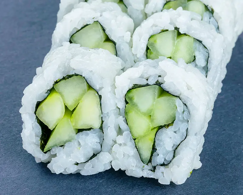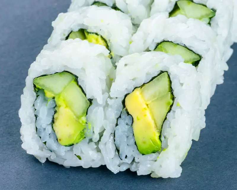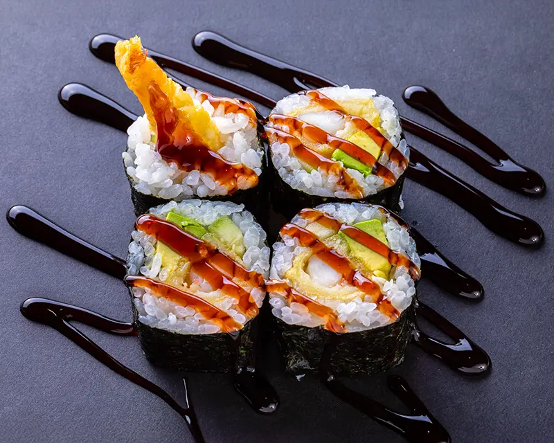 Shrimp tempura, avocado, and cucumber with eel sauce.