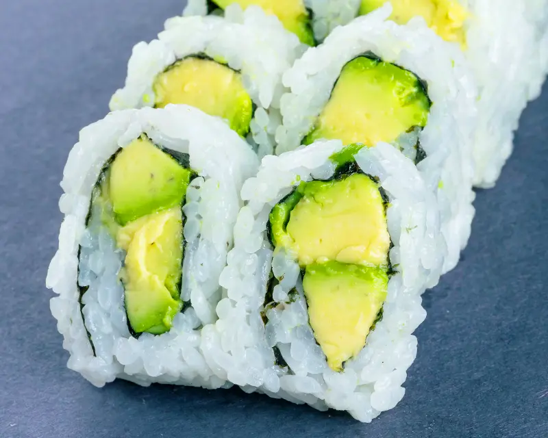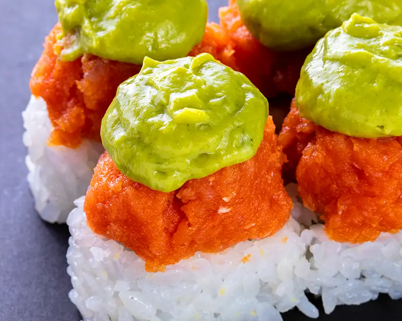 Spicy tuna and guacamole on top of a California roll.