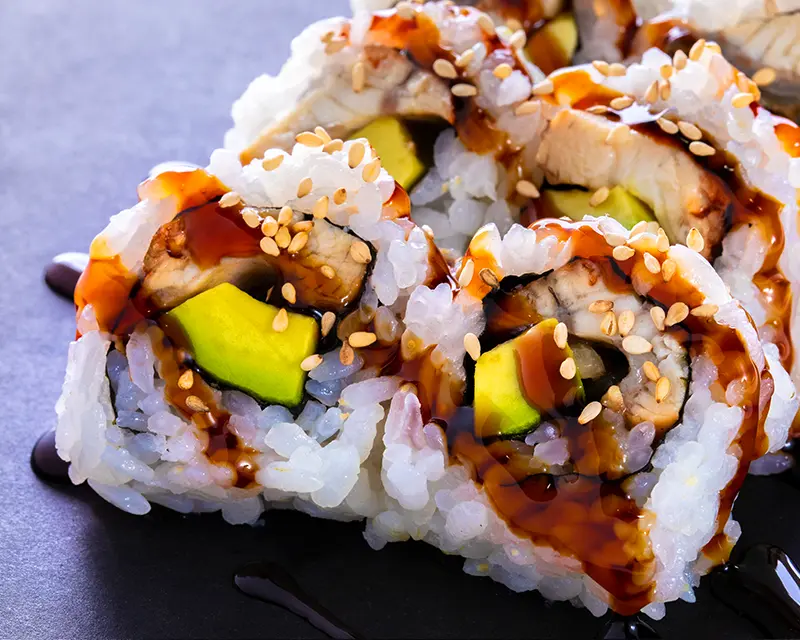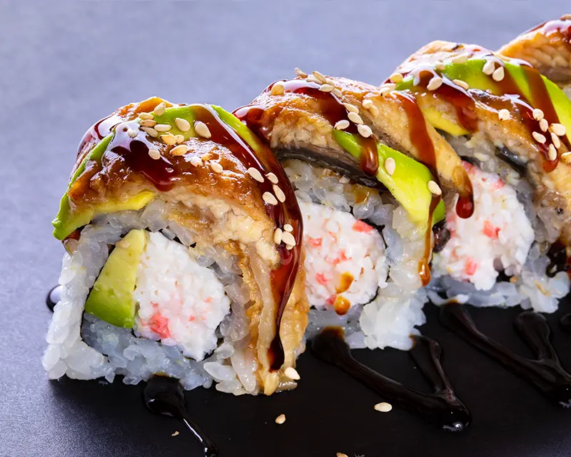 California roll. Topped with eel, avocado, eel sauce, and sesame seeds.