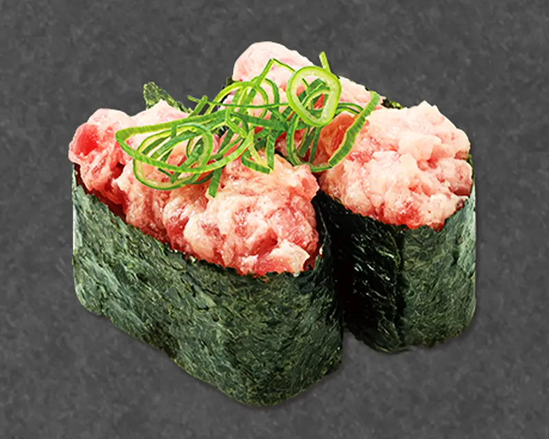 Spicy albacore and crunchy onion on top of a California roll.