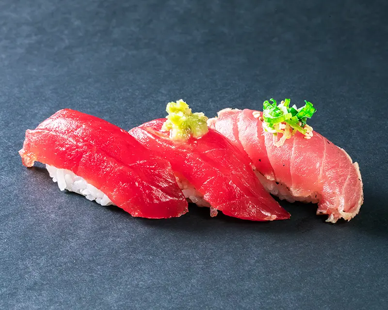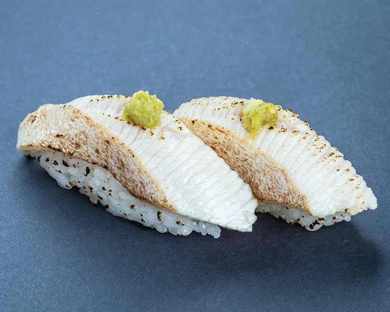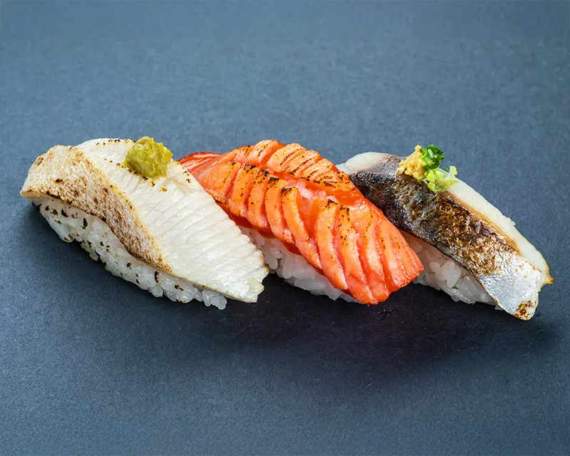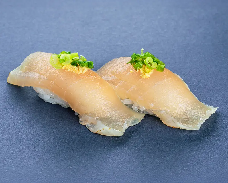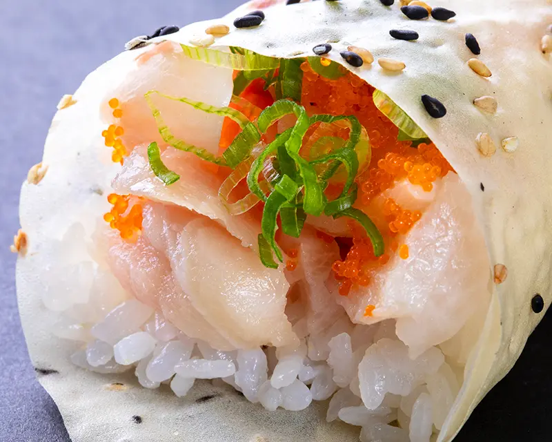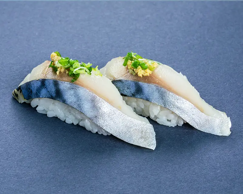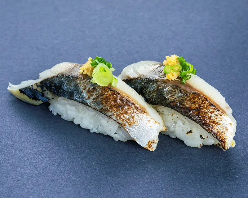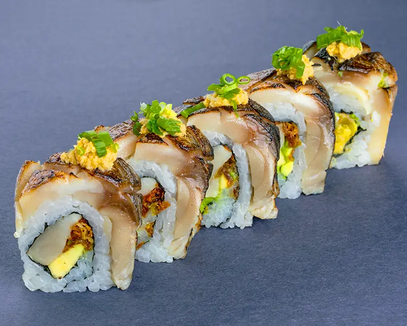 Japanese mackerel, fried onion, avocado, and ginger roll. Topped with seared Japanese mackerel, ginger, and green onion.
