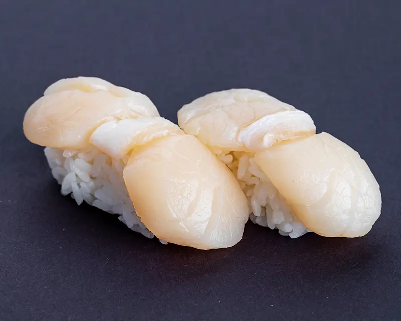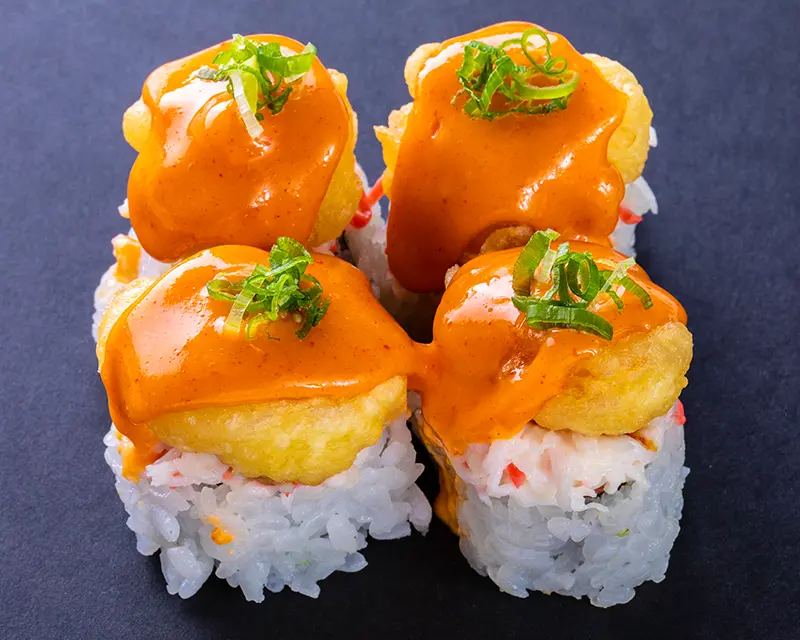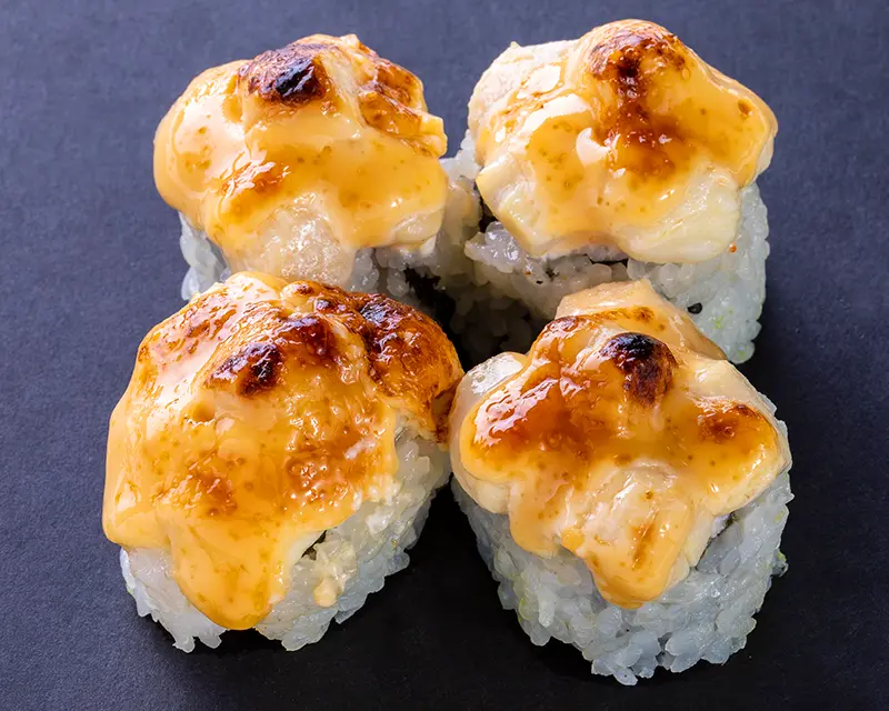 Bay scallop and dynamite sauce on top of a California roll.