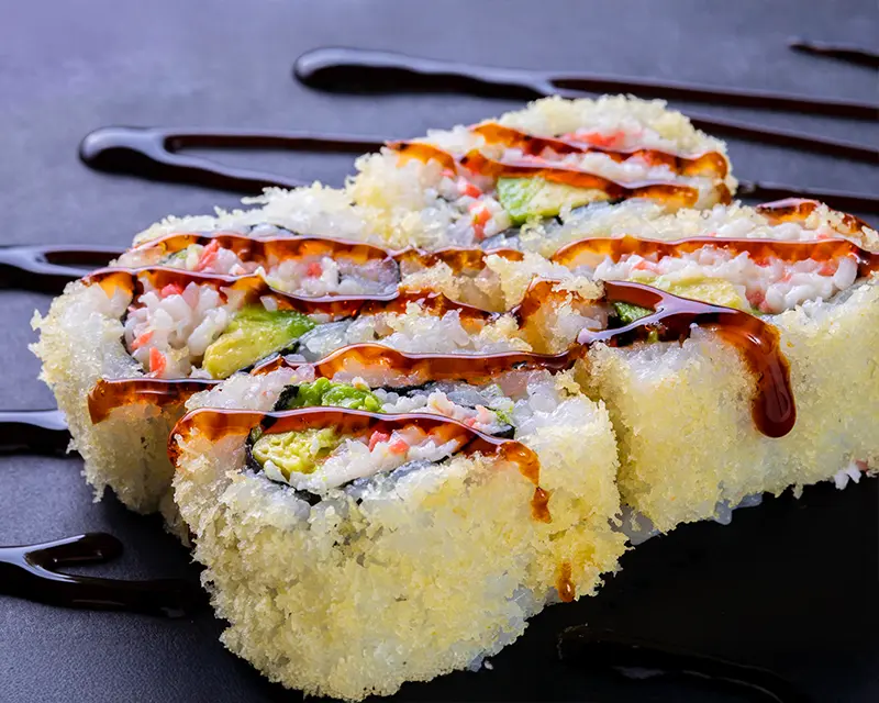 California roll with crunchy flakes and eel sauce.