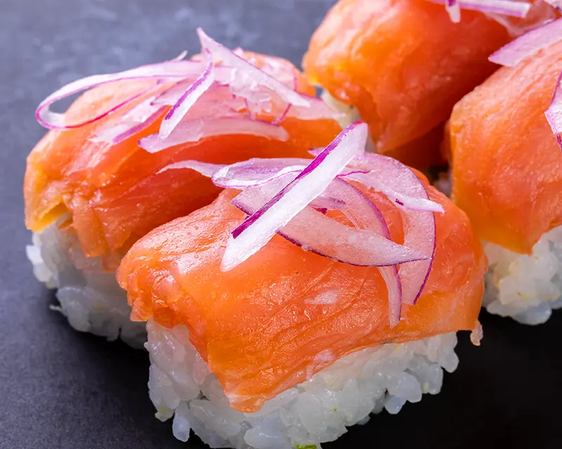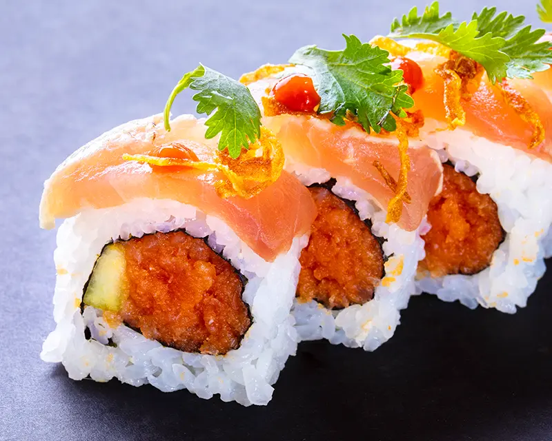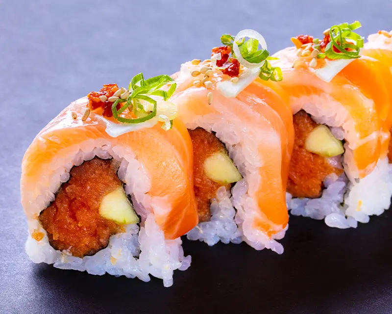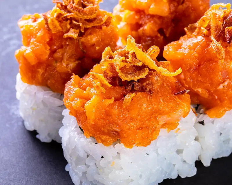 Spicy salmon and crunchy onion on top of a California roll.