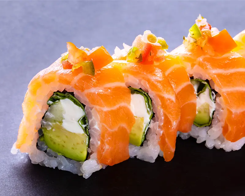 Lettuce, avocado, cucumber, and cream cheese roll. Topped with salmon and ceviche sauce.
